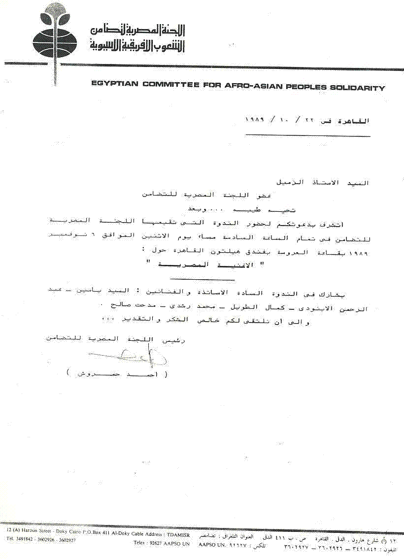 دعوة لحضور ندوة تقيمها اللجنة المصرية للتضامن : "حول الأغنية المصرية".