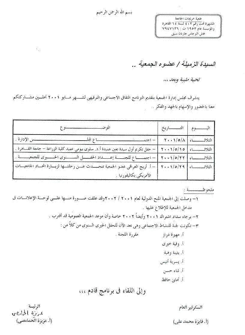 برنامج جمعية خريجات الجامعة لشهر مايو 2001.