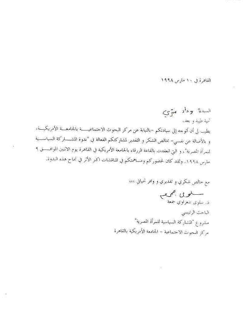 خطاب شكر من مركز البحوث الإجتماعية بالجامعة الأمريكية للمشاركة الفعالة فى ندوة " المشاركة السياسية للمرأة المصرية".