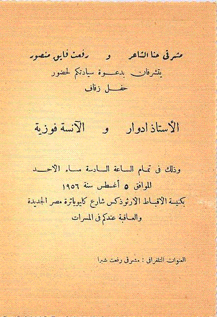 دعوة لحضور حفل زفاف الاستاذ "ادوار" على الانسة "فوزية".