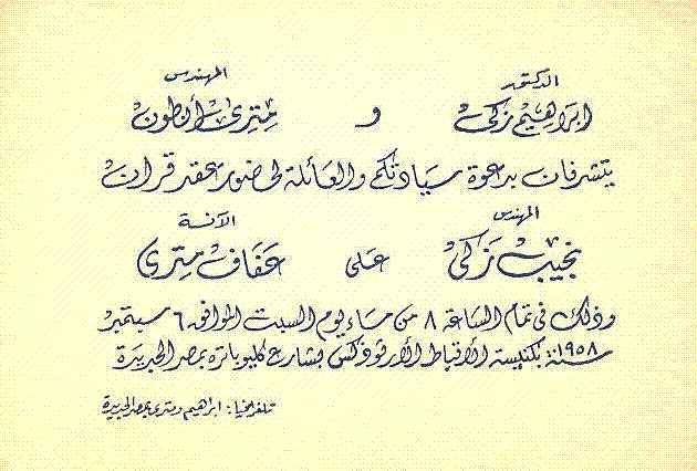 دعوة لحضور عقد قران المهندس" نجيب زكى" على الانسة "عفاف مترى".