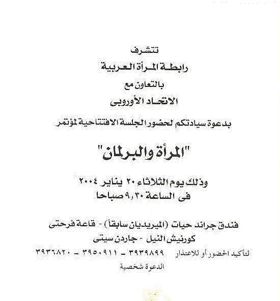 دعوة من رابطة المراة العربية بالتعاون مع الأتحاد الأوروبى لحضور الجلسة الافتتاحية لمؤتمر “المرأة و البرلمان”