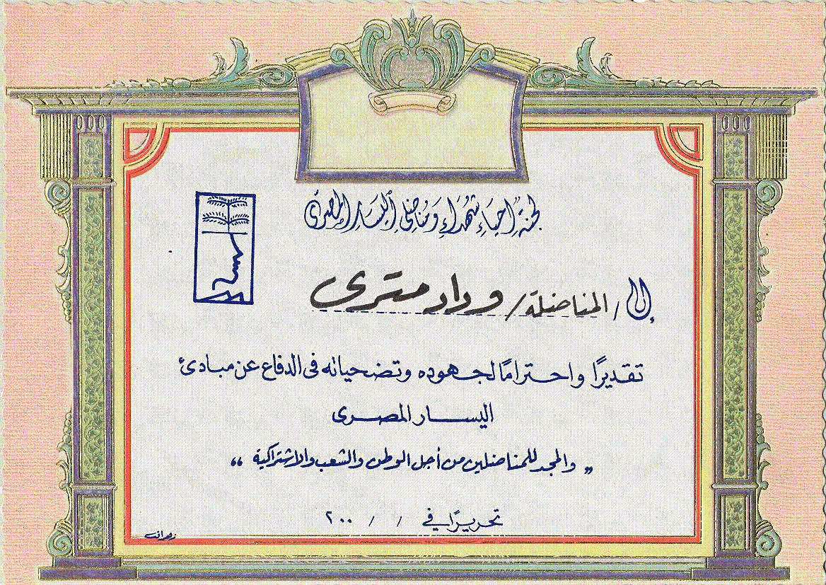WMH1.26.1 9 January 2015 شهادة تقدير و احترام من لجنة احياء شهداء و مناضلى اليسار المصرى للسيدة وداد مترى.
